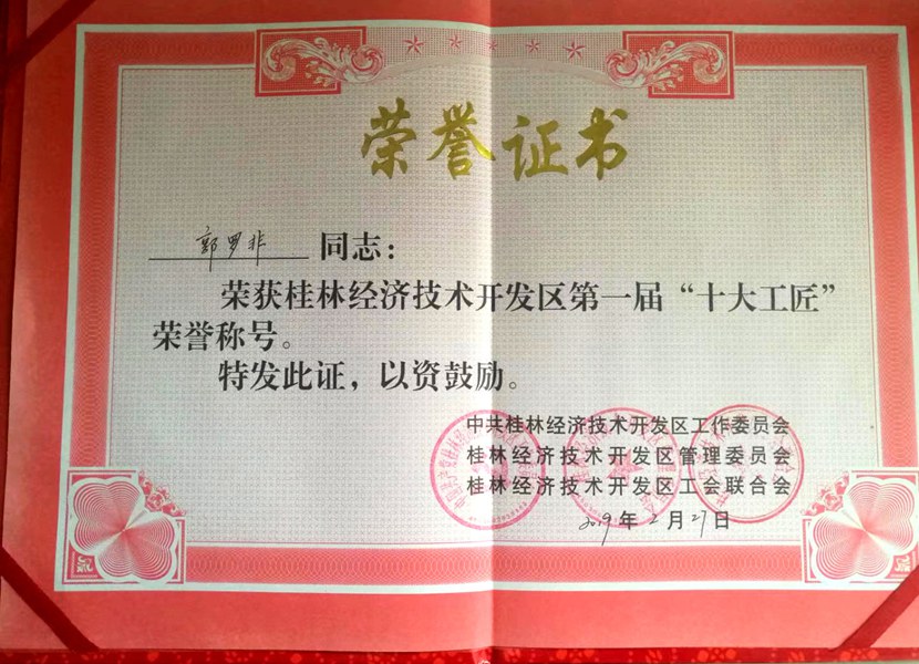 為激發(fā)廣大職工在大眾創(chuàng)業(yè)、萬眾創(chuàng)新滾滾洪流中實現(xiàn)自身價值、綻放時代風采,為建設桂林經(jīng)開區(qū)作出新貢獻,2019年2月,桂林經(jīng)濟技術(shù)開發(fā)區(qū)黨工委、管委組織開展桂林經(jīng)開區(qū)第一屆“十大工匠”評選活動,經(jīng)層層篩選,我司總經(jīng)理助理兼紙箱部經(jīng)理郭羅非先生獲得桂林經(jīng)開區(qū)第一屆“十大工匠”殊榮。