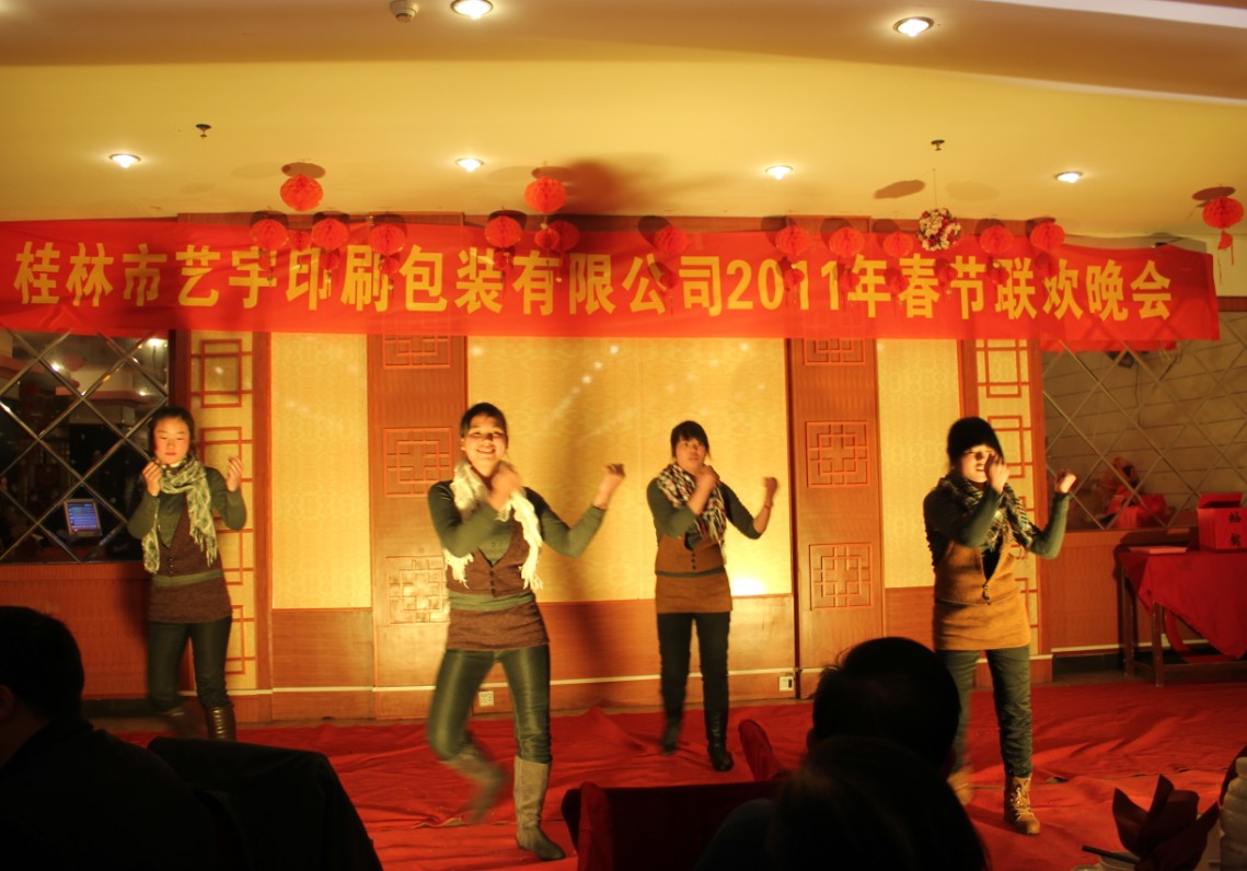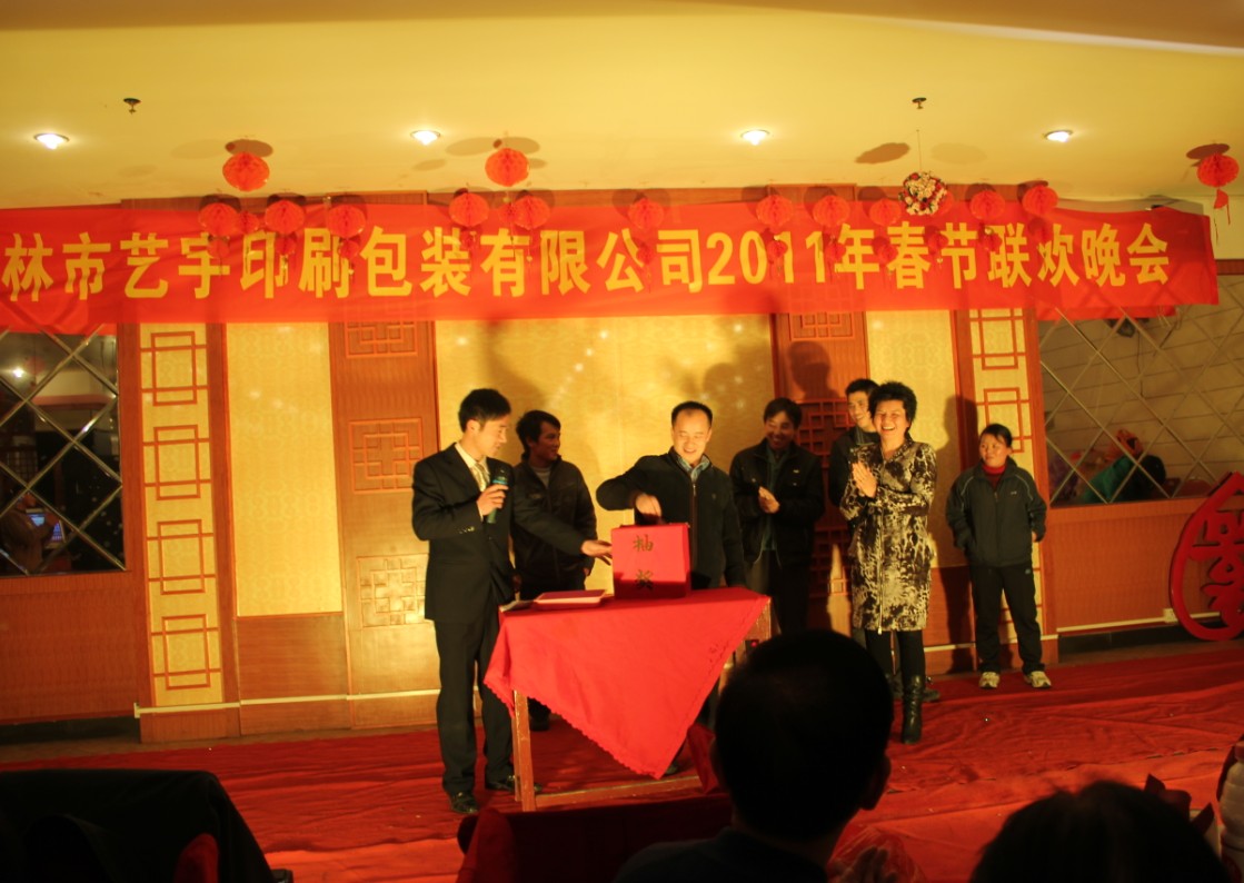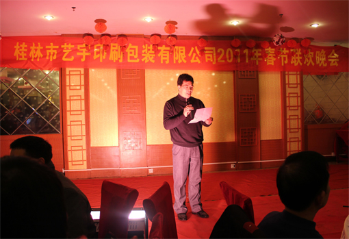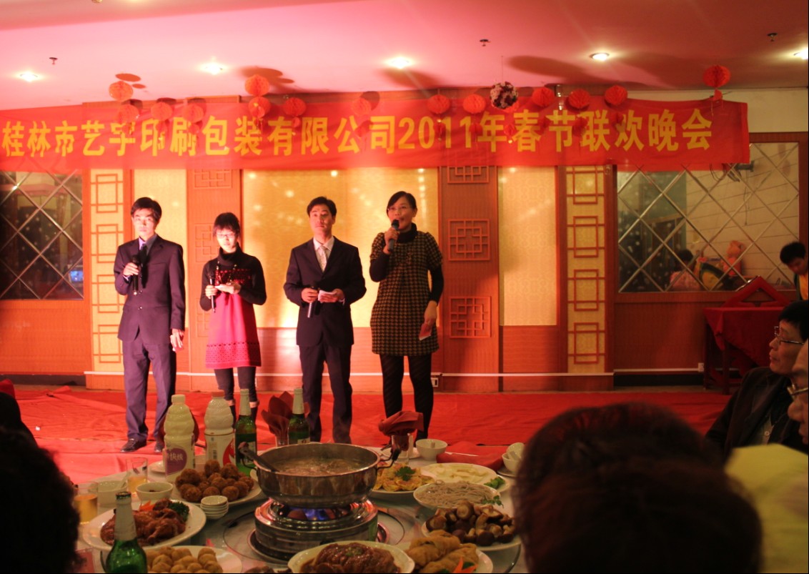 金虎報(bào)捷去,玉兔送春來,在辭舊迎新的喜慶日子里,“桂林市藝宇印刷包裝有限公司2011年春節(jié)聯(lián)歡晚會(huì)”于2011年元月26日18時(shí)18分在永?h金海岸商務(wù)酒店隆重舉行。譚董事長(zhǎng)、林總經(jīng)理及桂林藝宇全體員工歡聚一堂,回首昨日的輝煌成績(jī),展望明天的美好未來。